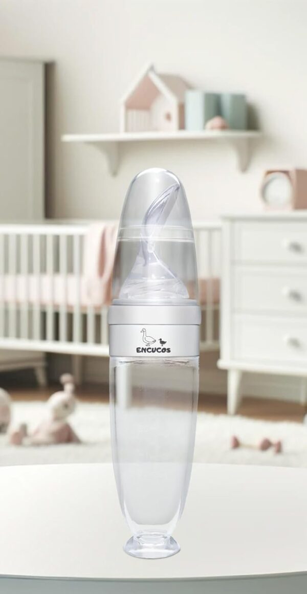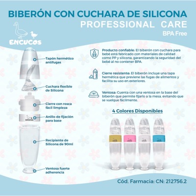 ¡La solución perfecta para alimentar a tu bebé! Nuestro biberón con cuchara de silicona cuenta con una ventosa en la base para evitar derrames. ¡Una madre feliz y su bebé disfrutan de comidas sin preocupaciones!